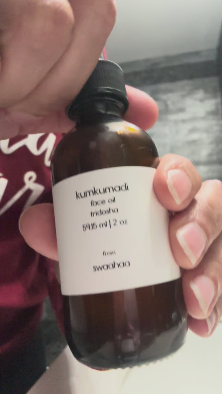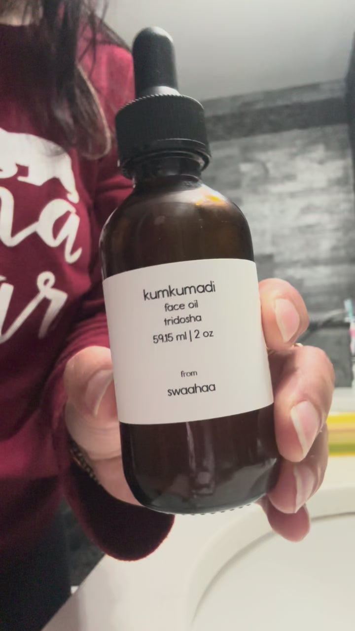Swaahaa’s Kumkumadi: a potent blend of organic coconut, almond, and sesame oils, carefully infused with a bouquet of Kashmiri saffron, turmeric, roses, sandalwood, manjistha, amla, and mulethi. Each ingredient is selected for its purity, therapeutic value, and ability to restore the skin’s natural glow.
